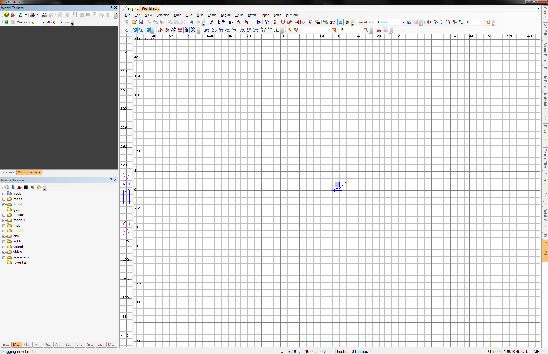 When you first open the idStudio Editor, you will see three main panes—the World Editor itself, the World Camera, and the Media Browser.