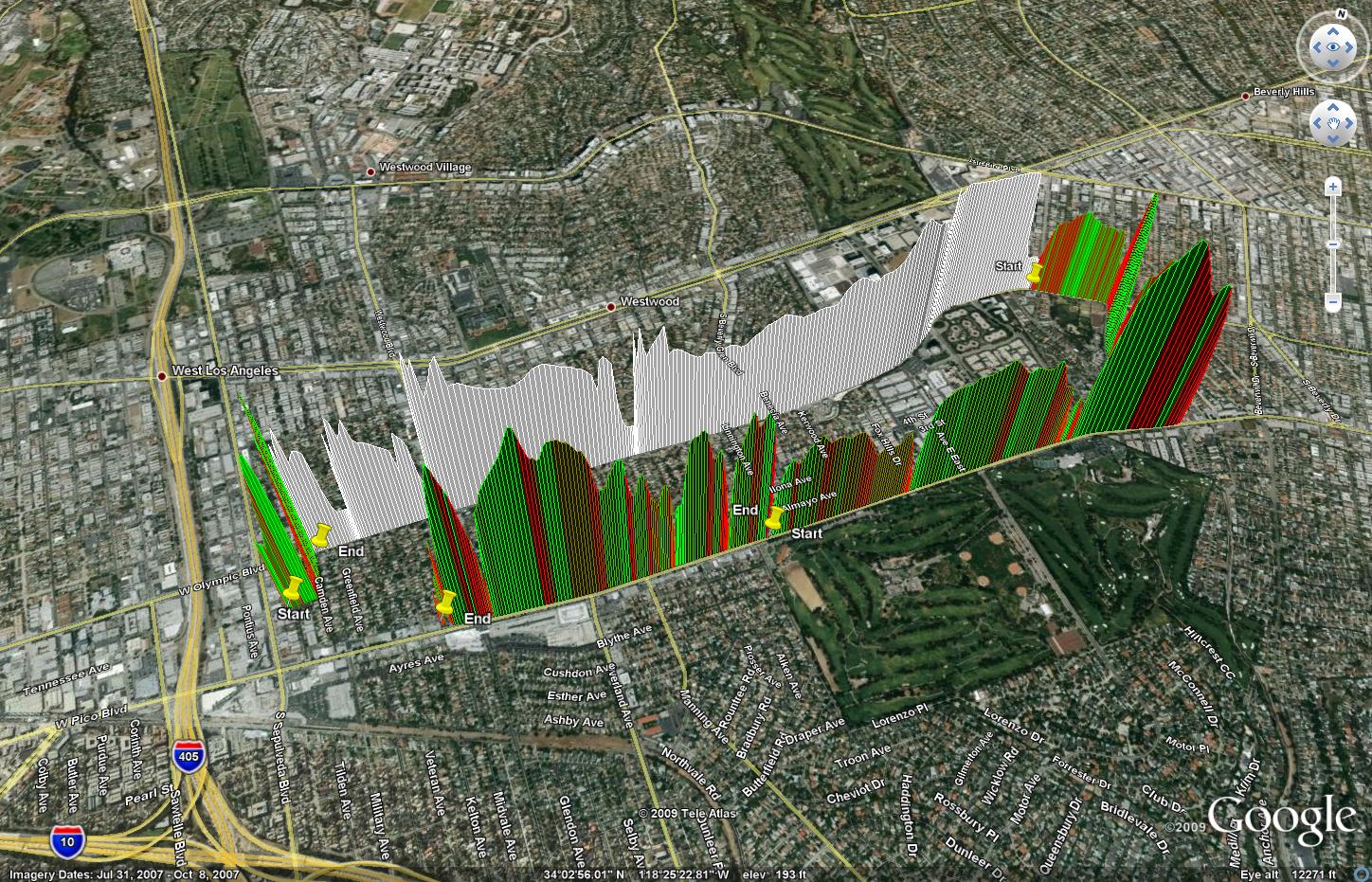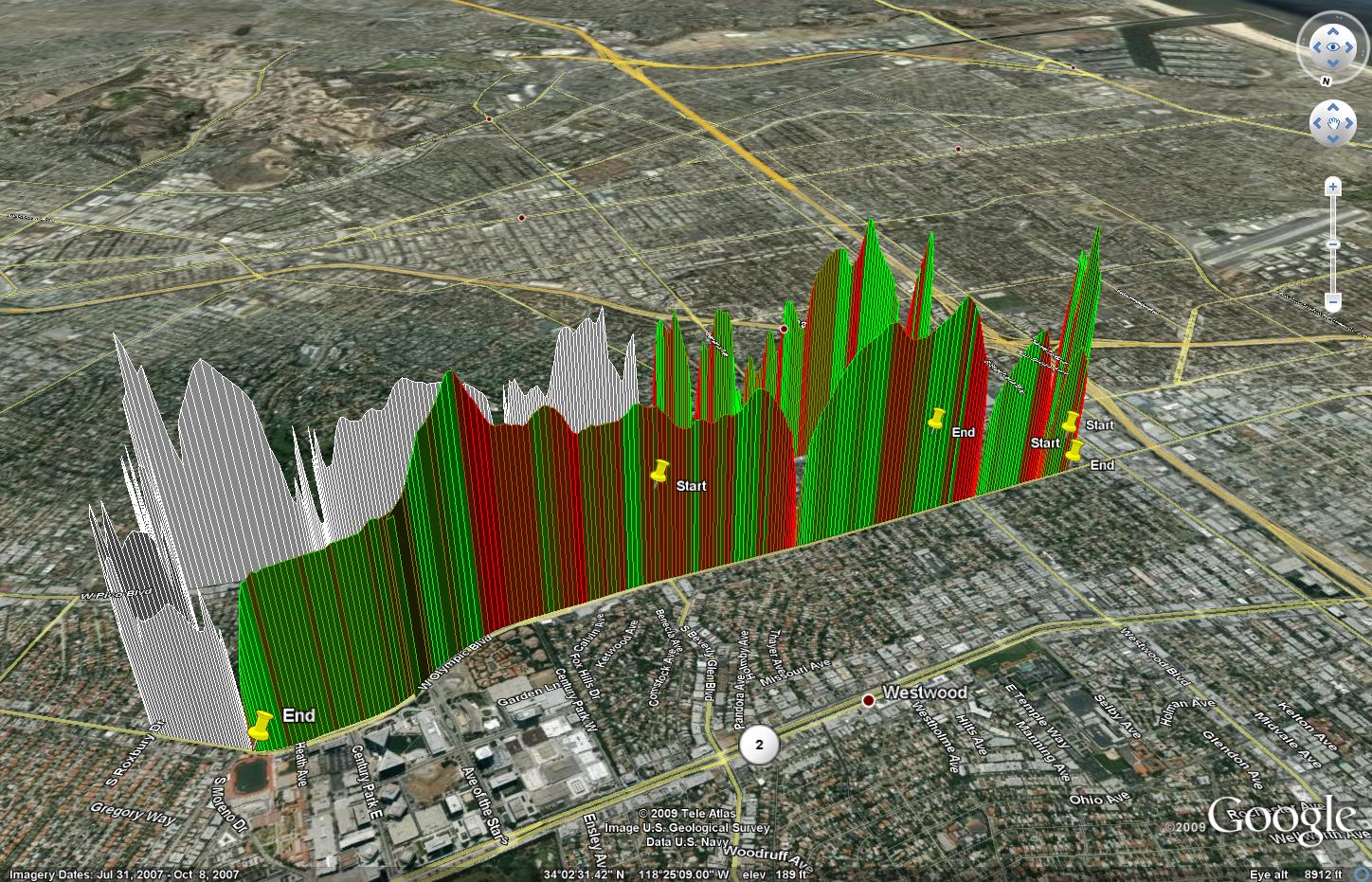 Height at each point indicates speed, and color indicates engine efficiency at the time. You can see the MPG plummet as we accellerate away from stops, and hit the maximum value as we slow down. The white graph indicates engine RPM.